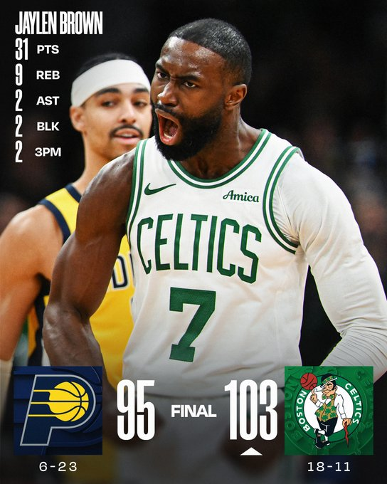 Jaylen Brown firmó 31 puntos y se adueñó del último cuarto con 14 para una remontada desde -20. Derrick White añadió 19 y Boston ganó su tercer partido al hilo pese a una noche errática desde el triple. Indiana desperdició una gran primera mitad (60% en triples) y erró 19 de 20 tiros largos tras el descanso; Pascal Siakam anotó 25.
