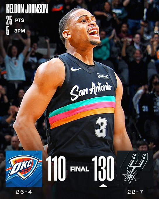 San Antonio Spurs confirmó que es la “kryptonita” de Oklahoma City Thunder y le ganó con claridad. El mejor del elenco texano terminó siendo Keldon Johnson, que sumó 25 unidades.