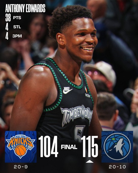 Minnesota se quedó con una grandísima victoria ante New York Knicks. El elenco del Lobo encontró una gran versión de Anthony Edwards, que metió 38 tantos. Del otro lado, Karl-Anthony Towns no pudo vencer a su exequipo, pero firmó un doble-doble de 40 puntos y 13 rebotes.