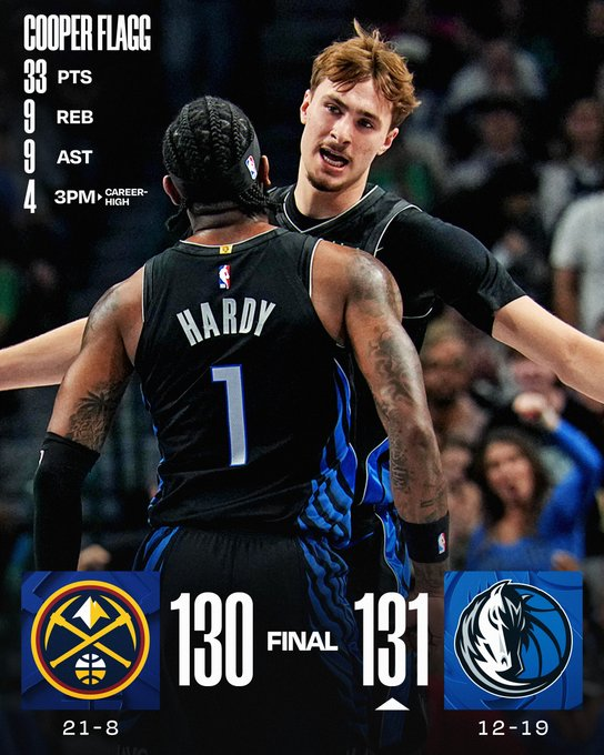 En uno de los grandes partidos de la noche, Dallas Mavericks le ganó a Denver Nuggets. Cooper Flagg jugó uno de sus grandes partidos en la NBA, sumando 33 puntos, 9 asistencias y 9 rebotes. Por el lado de los perdedores sobresalió Jamal Murray, con 31 tantos y 14 asistencias.