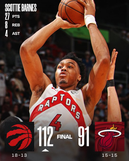 Toronto se quedó con una gran victoria en Florida ante Miami Heat. El mejor del elenco de Canadá terminó siendo Scottie Barnes, que aportó 27 puntos, 8 rebotes y 4 asistencias. Norman Powell fue el mejor del Heat, aportando 17 unidades.