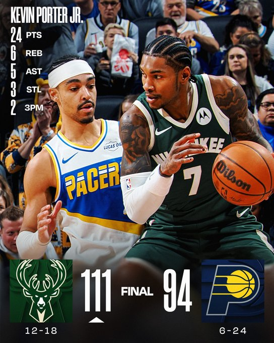 Milwaukee Bucks le ganó a Indiana como visitante y Kevin Porter Jr. fue el mejor del elenco de Doc Rivers. El ex Rockets metió 24 tantos, bajó 6 rebotes y repartió 5 asistencias.