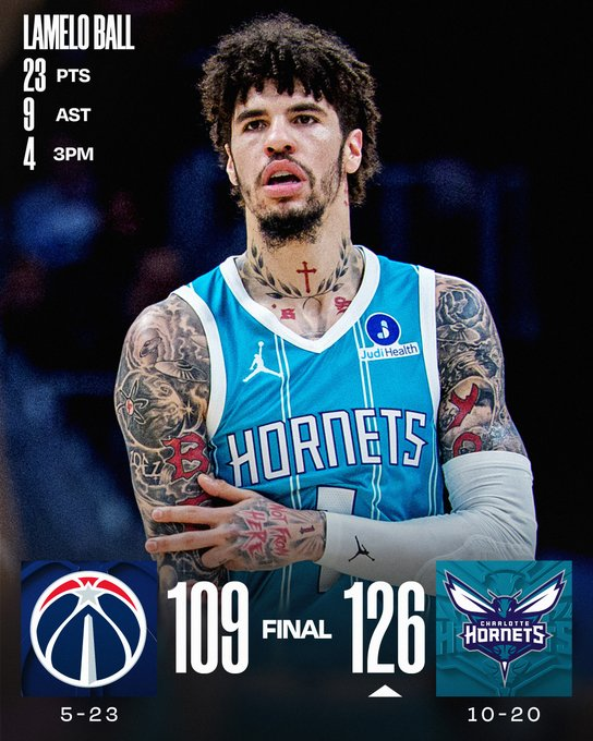 La jornada arrancó con la victoria de Charlotte Hornets ante Washington Wizards. El mejor del encuentro fue LaMelo Ball, que aportó 23 puntos, 9 asistencias y 2 rebotes. En el equipo de la capital se destacó CJ McCollum, con 14 unidades.