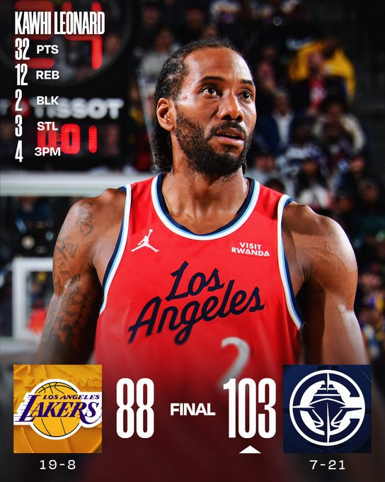 Kawhi Leonard fue la figura con 32 puntos y 12 rebotes, mientras que Harden aportó 21 tantos y 10 asistencias. LeBron James se destacó en los Lakers con 36 unidades Los Clippers (7-21), uno de los peores equipos del Oeste y de la liga, vencieron 103-88 a su rival angelino (19-8) con 32 puntos y 12 rebotes de Kawhi Leonard, 21 puntos y 10 rebotes de James Harden y 17 puntos y 12 rebotes de John Collins.