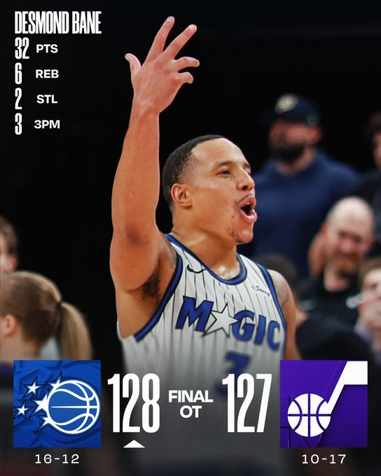 Orlando le arrebató la victoria a Utah en un final imposible. En la última pelota del tiempo suplementario, Desmond Bane anotó el doble con el que sentenció el 128-127 con el que el Magic firmó el triunfo. El guardia lideró al ganador con 32 puntos. Keyonte George (27) fue el mejor del Jazz.