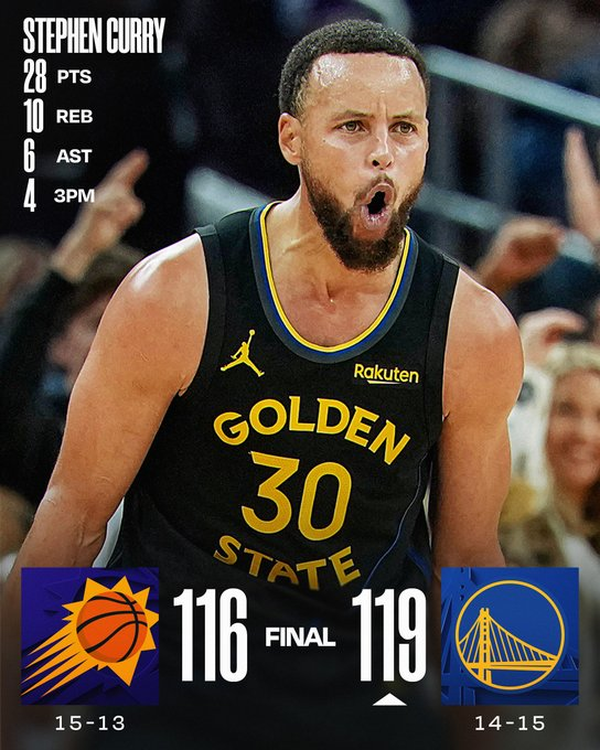 Stephen Curry anotó 28 puntos, capturó nueve rebotes y repartió seis asistencias, Jimmy Butler sumó 25 unidades y los Warriors de Golden State quebraron una racha de tres derrotas al superar el sábado 119-116 a los Suns de Phoenix. Un triple de Jordan Goodwin con 1:10 minutos por jugar redujo la diferencia a dos puntos antes de que Butler respondiera en el otro extremo con una bandeja y una jugada de tres puntos. Collin Gillespie falló un triple desde la línea de fondo con 18 segundos restantes y Curry convirtió un par de tiros libres antes de que Gillespie encestara desde lejos con diez segundos por jugar.