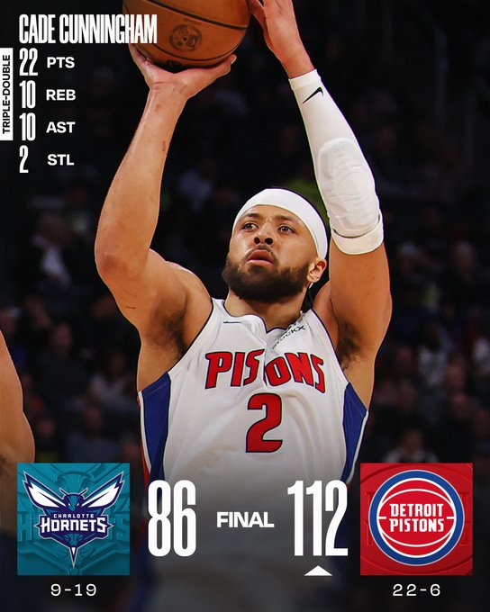 Además, en Detroit, los Pistons derrotaron a Charlotte Hornets por 112-86 con un triple-doble de Cade Cunningham, que firmó 22 puntos, 10 rebotes y 10 asistencias para los líderes del Este. Los locales siempre estuvieron por encima en el marcador y se llevaron el encuentro gracias a que Cade Cunningham hizo un triple-doble, 22 puntos, 10 asistencias y 10 rebotes, y Jalen Duren hizo un doble-doble con 19 anotaciones y 11 rebotes.