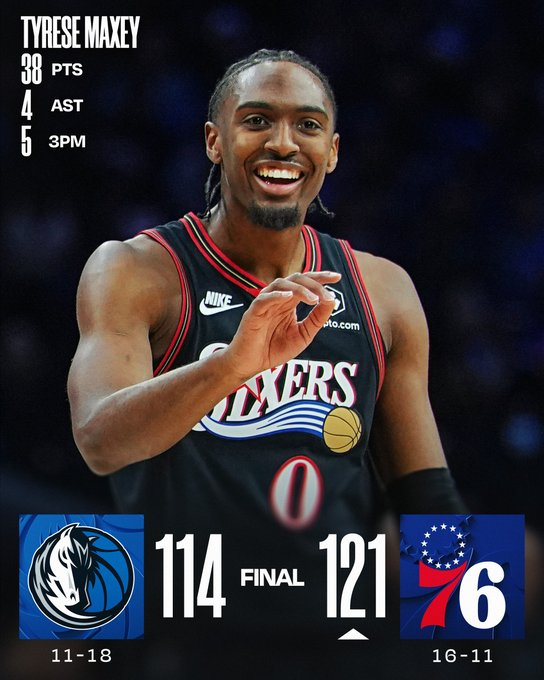 Tyrese Maxey anotó 38 puntos, incluidos siete durante un tramo clave del último cuarto, y VJ Edgecombe agregó 26 para que los Philadelphia 76ers derrotaran el sábado 121-114 a los Dallas Mavericks. Dominick Barlow sumó 21 puntos por Filadelfia, que jugó sin Joel Embiid (enfermedad y manejo de lesión en la rodilla derecha) y sin Paul George (manejo de lesión en la rodilla izquierda). Embiid se perdió su segundo compromiso consecutivo y el decimosexto de la temporada.
