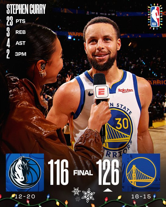 Golden State arruinó el debut navideño de Cooper Flagg al vencer 126-116 a Dallas. Los Warriors dominaron durante casi todo el desarrollo, estando abajo solo en un rato del primer cuarto y llegando a meter una máxima de 17.