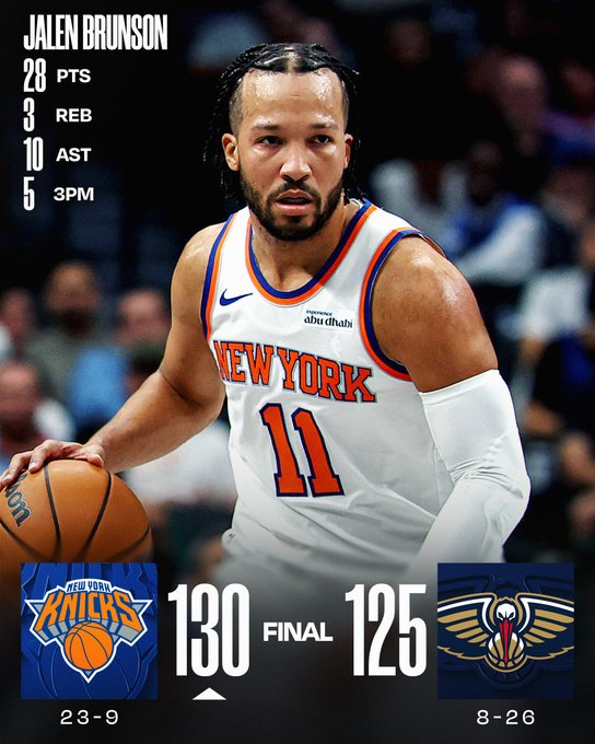 Los Knicks quedaron un pasito más cerca de Detroit en la punta del Este al vencer a los Pelicans de visitantes por 5 con otra sólida tarea de Jalen Brunson (28 puntos y 10 asistencias). OG Anunoby agregó 23 puntos y 11 rebotes, Mohamed Diawara tuvo el mejor partido de su carrera con 18 puntos y Karl-Anthony Towns 12 y 12. Tercer ganado en fila por los Knicks.