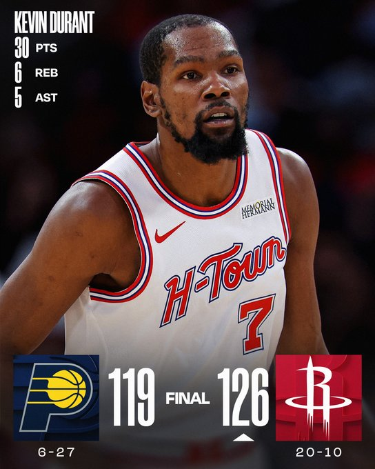 Con 30 puntos de Kevin Durant y 20 de Amen Thompson, los Rockets vencieron a Indiana, que sufrió su novena derrota consecutiva. Fue la primera vez desde que KD llegó a Houston que mete 30 en dos partidos consecutivos. Los Rockets dominaron claramente todo el partido y el resultado fue más amplio de lo que reflejó el score.