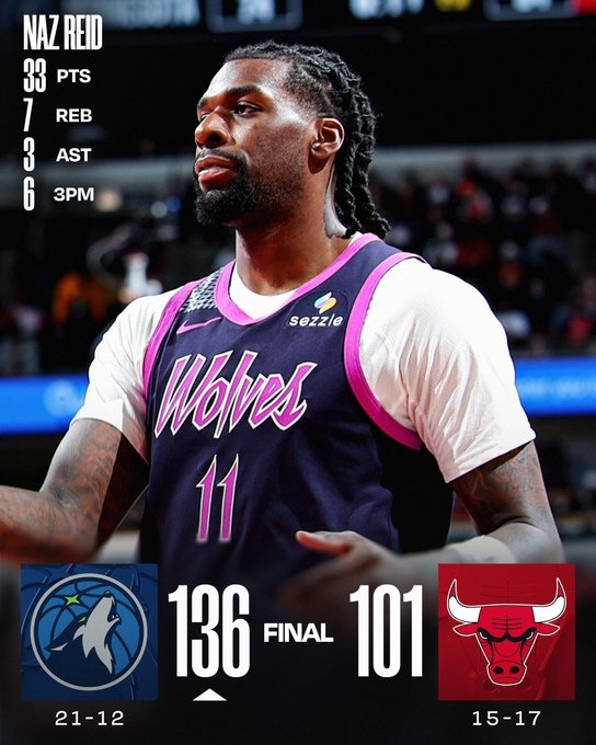 Amplísimo triunfo de los de Prigioni en el histórico United Center, con 33 de Nazr Reid y 23 de Ant Edwards. Los Wolves siguen expectantes en el sexto puesto del Oeste, pero muy cerquita del segundo lugar.