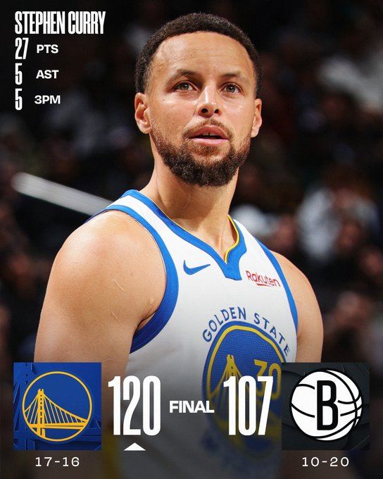 Con el mago Curry en modo humano («solo» 27 puntos y 5/12 triples), los Warriors ganaron en Brooklyn y lograron su cuarto triunfo en cinco partidos, recuperándose de la caida ante Toronto.