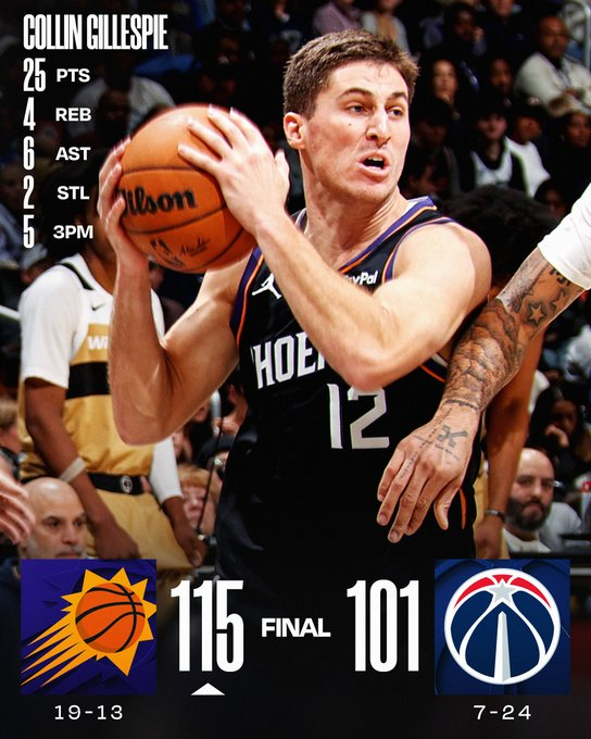 Dillon Brooks anotó 26 puntos, Collin Gillespie otros 25 y Devin Booker 22 para que los Suns obtengan su cuarta victoria en fila y quinta en sus útimos 6 partidos. El equipo no contó con Mark Williams, suspendido por un partido tras su trifulca con José Alvarado. Phoenix cierra el miércoles su gira de 4 partidos en Cleveland.
