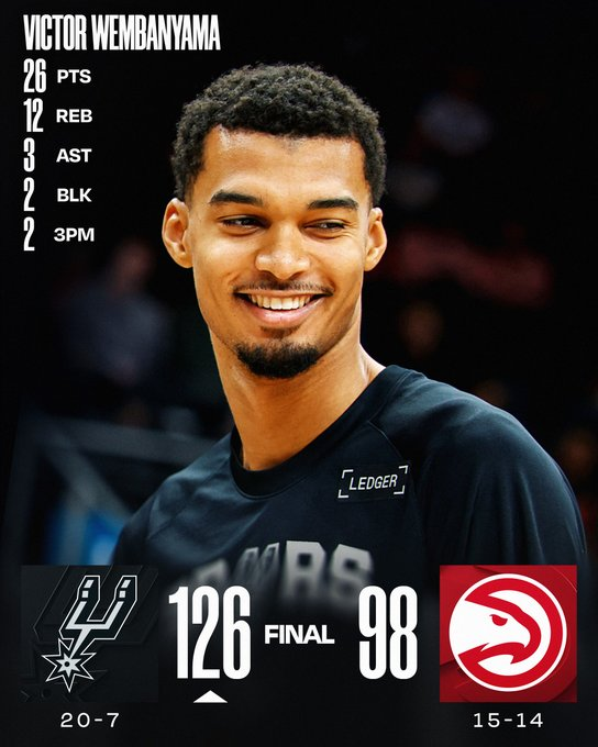Victor Wembanyama fue la gran figura con 26 puntos y 12 rebotes en una actuación dominante de San Antonio, que controló el partido de principio a fin. Los Spurs sacaron una amplia ventaja antes del descanso y resolvieron el juego sin sobresaltos ante unos Hawks superados.