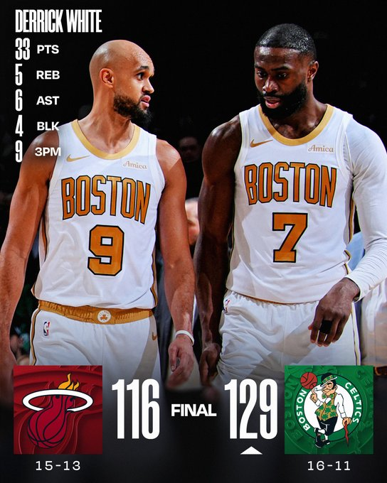 Derrick White tuvo su mejor noche de la temporada con 33 puntos y nueve triples, encabezando el despegue de Boston en la segunda mitad. Los Celtics marcaron diferencias en el último cuarto a puro tiro exterior y profundizaron el flojo momento de Miami como visitante.