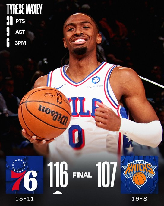 Tyrese Maxey brilló con 30 puntos y lideró a Philadelphia en el último cuarto para conseguir una valiosa victoria en el Madison Square Garden. Los Knicks, que venían de consagrarse en la NBA Cup, se quedaron sin anotación en el cierre y vieron cortada su racha positiva en casa.