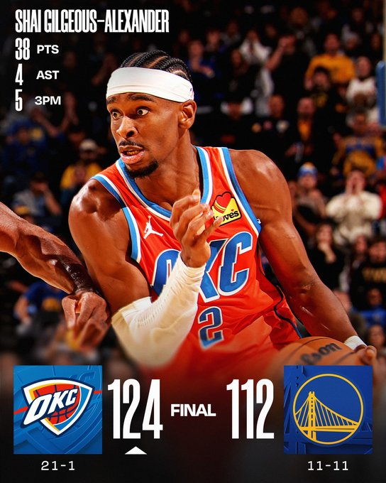 Cerramos la jornada con la victoria visitante del vigente campeón de la NBA. Oklahoma City Thunder sigue arrollando y alcanzó un récord de 21-1 tras derrotar a Golden State Warriors por 124-112. Shai Gilgeous-Alexander continúa haciendo méritos para un posible back-to-back de MVP, aportando 38 puntos, 3 rebotes y 4 asistencias.
