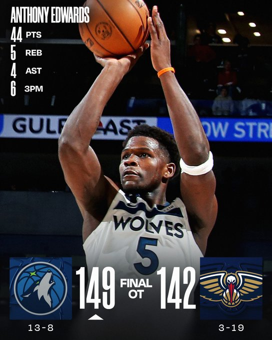 Una de las dos victorias visitantes de la jornada fue la de Minnesota Timberwolves en la casa de New Orleans Pelicans por 149-142 en tiempo suplementario. El conjunto de Finch brilló gracias a Anthony Edwards, autor de 44 puntos. En los locales, Trey Murphy III se destacó con 33 unidades y 15 rebotes.