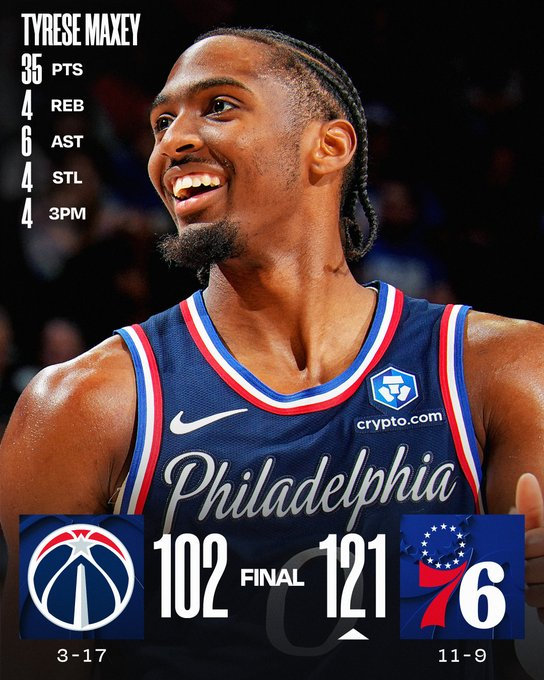 La jornada arrancó con una victoria del equipo local. Los Sixers se impusieron ante Washington por 121-102, con una gran actuación de Tyrese Maxey, quien aportó 35 puntos, 6 asistencias y 4 rebotes.