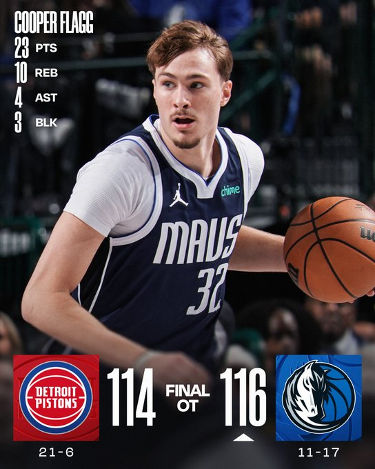 Cooper Flagg brilló con 23 puntos y 10 rebotes, y Anthony Davis selló el triunfo con dos volcadas decisivas en el suplementario. Detroit desperdició 25 rebotes ofensivos y tuvo a Cade Cunningham en modo triple-doble (29-10-10), pero falló en la prórroga. Dallas ganó por sexta vez en ocho partidos.