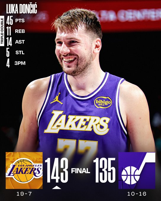 Luka Doncic firmó una actuación monumental: 45 puntos, 14 asistencias y 11 rebotes para liderar la remontada angelina. LeBron James acompañó con 28 y 10 asistencias en un cuarto final de 41-29. Utah tiró 65% en la primera mitad, pero no pudo sostener el ritmo ante el show de Luka.