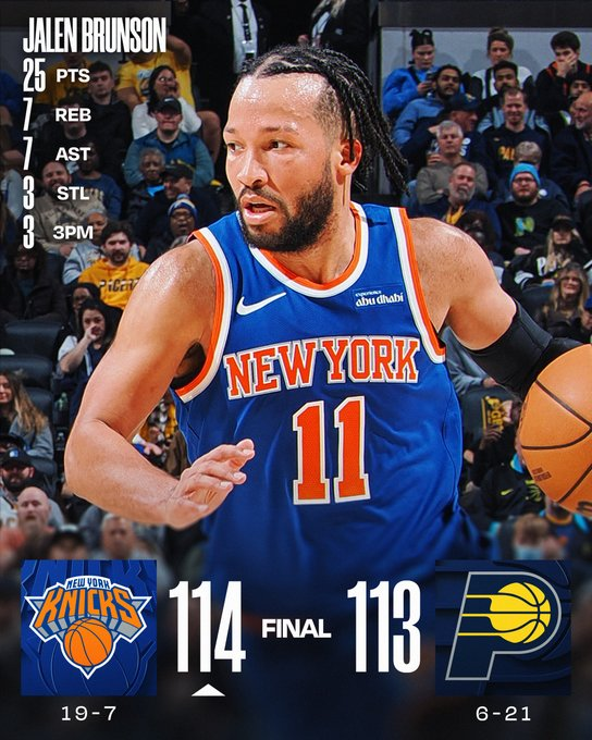 Jalen Brunson clavó el triple ganador a 4.4 segundos del final y OG Anunoby sentenció con un robo clave para extender la racha de los Knicks a siete triunfos. Brunson firmó 25 puntos, 7 rebotes y 7 asistencias, mientras Tyler Kolek sorprendió con 16 puntos y 11 asistencias. Indiana tuvo a Andrew Nembhard encendido con 31 tantos, pero volvió a quedarse corto en el cierre.