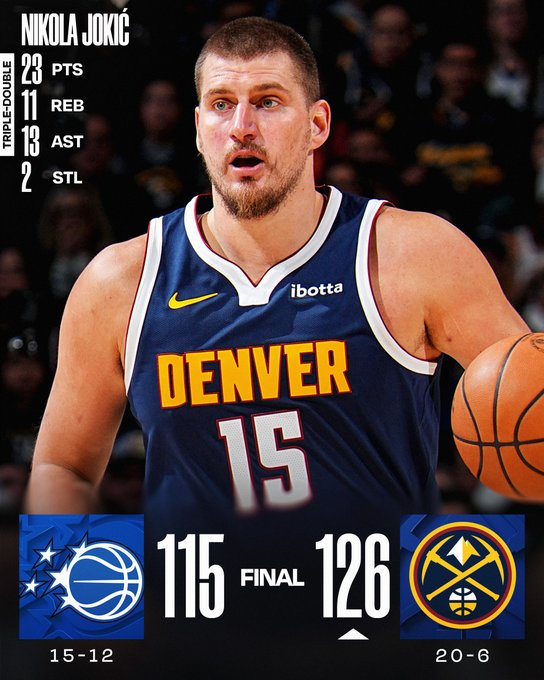 Nikola Jokic hizo historia: 23 puntos, 13 asistencias y 11 rebotes para convertirse en el pivote con más asistencias de todos los tiempos. Jamal Murray fue clave con 32 puntos y un segundo cuarto demoledor. Orlando respondió con triple-doble de Paolo Banchero (26-16-10), pero no pudo