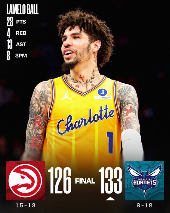 LaMelo Ball volvió tras tres partidos afuera y fue un vendaval: 28 puntos, 13 asistencias y un impactante 8/11 en triples, con siete bombas solo en la primera mitad. Charlotte igualó el récord NBA y de franquicia con 18 triples en un tiempo y terminó con 24/49 desde tercera dimensión. Kon Knueppel (28) y Brandon Miller (26) acompañaron el show. En Atlanta, Jalen Johnson rozó el triple-doble con 43 puntos, 11 rebotes y 9 asistencias.