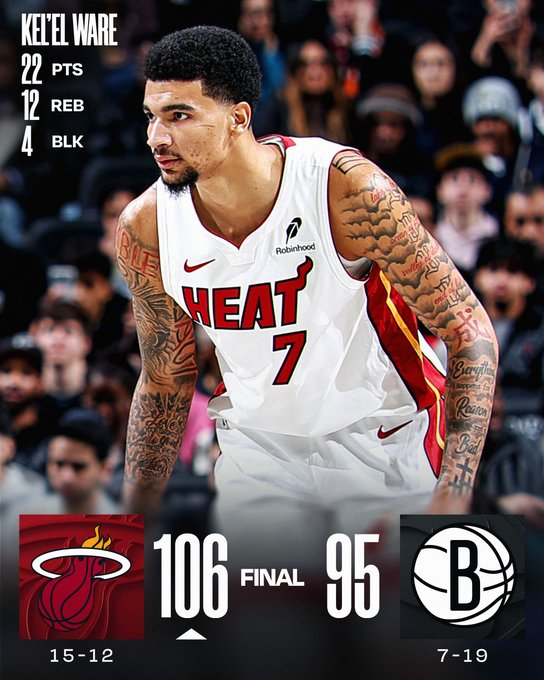Miami cortó una racha de cinco derrotas con un triunfo sólido, liderado por Norman Powell (24 puntos) y un enorme Kel’el Ware, autor de 22 puntos, 12 rebotes y 4 tapas. Bam Adebayo bajó 17 rebotes pese a problemas de faltas. Brooklyn, que venía de una paliza histórica, tiró apenas 22% en triples y se desinfló en el último cuarto.