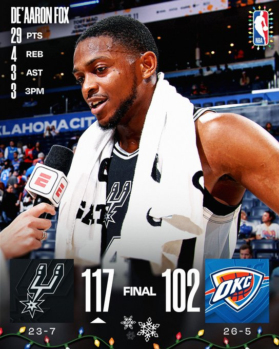 Jueves de NBA con cinco partidos en día de navidad y donde los dos primeros juegos vieron que a San Antonio le sienta bien el campeón, pues fue victoria 117-102 ante OKC, la tercera en menos de 2 semanas y donde la figura del encuentro fue De’Aaron Fox, con 29 unidades.