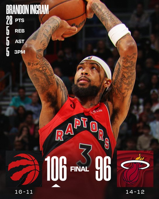 Brandon Ingram fue decisivo con 28 puntos y una planilla quirúrgica desde el perímetro (5/7 en triples) para cortar una racha negativa de cuatro derrotas de Toronto. Scottie Barnes firmó un doble-doble de 17 puntos y 10 rebotes, mientras que Immanuel Quickley sumó 15 en un equipo que convirtió 16 triples. Miami, sin Tyler Herro y con la lesión temprana de Nikola Jovic, tuvo 20 puntos de Bam Adebayo y Norman Powell. Un parcial de 17-2 en el último cuarto inclinó el partido.