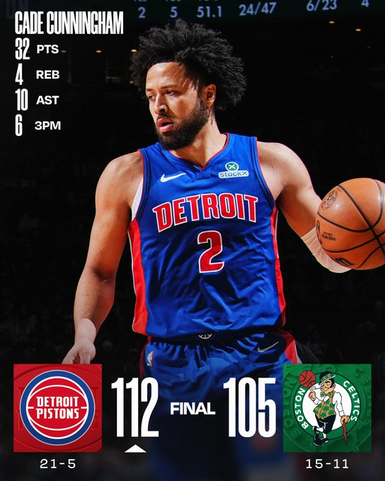 Cade Cunningham fue el eje absoluto del triunfo de Detroit en Boston con 32 puntos y 10 rebotes, liderando a unos Pistons que ganaron su cuarto partido consecutivo y se afianzan en la cima del Este. Caris LeVert y Tobias Harris aportaron 13 puntos cada uno en un equipo sólido en los cierres. En los Celtics no alcanzaron los 34 puntos, 8 rebotes y 7 asistencias de Jaylen Brown ni los 31 de Derrick White, en una noche de bajo acierto exterior colectivo (10/39 en triples).