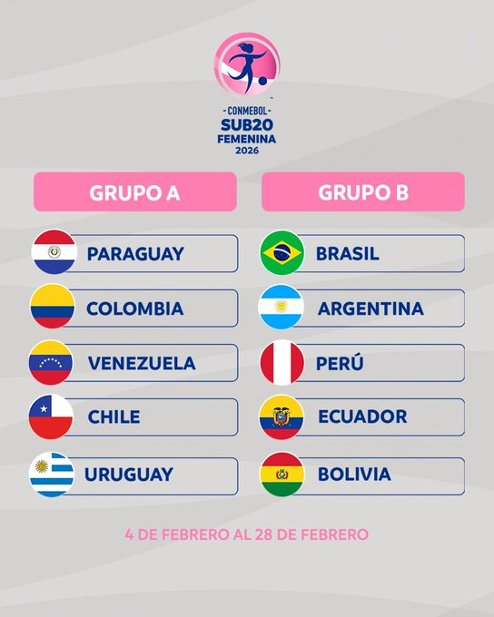 E ste jueves 18 de diciembre se realizó el sorteo para la Fase de Grupos de la CONMEBOL Sub20 Femenina 2026, que será disputada en Paraguay del 04 al 28 de febrero de 2026, con la participación de las diez selecciones nacionales femeninas Sub20 pertenecientes a las Asociaciones Miembro de la CONMEBOL.