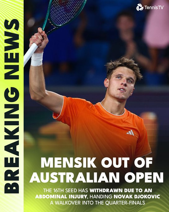 El jugador checo Jakub Mensik se retiró del Abierto de Australia debido a una lesión muscular en la zona abdominal. Tenía previsto enfrentarse al diez veces campeón Novak Djokovic el lunes en octavos de final. Con este resultado, el serbio avanza directamente a cuartos de final en Melbourne.