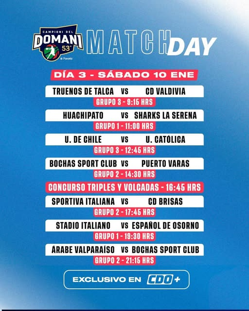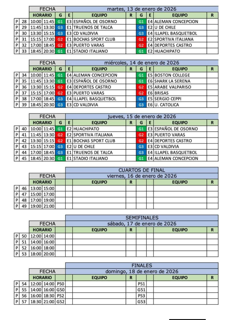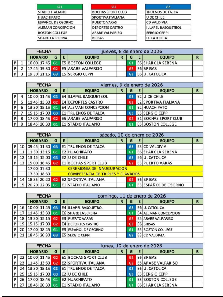 La competencia se inició el jueves 8 de enero, dando paso a una primera fase marcada por duelos de alto ritmo y exigencia competitiva. Hoy sábado 10 de enero, además de la jornada regular de partidos, se realizará la Ceremonia de Inauguración, junto a las tradicionales competencias de triples y clavados, uno de los momentos más esperados por el público y los participantes.
