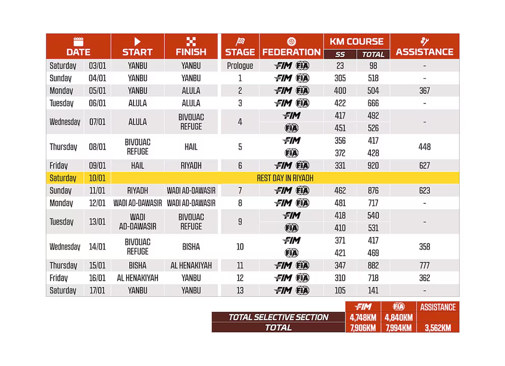 Organizado por la Amaury Sport Organisation (ASO) y por séptima vez consecutiva en suelo saudí, el Dakar mantendrá su esencia de desafío extremo con casi 8.000 kilómetros de recorrido total, de los cuales alrededor de 4.800 quedarán cronometrados en especiales de alta exigencia. La carrera partirá y finalizará en Yanbu, con un día de descanso programado en Riad, la capital saudí.