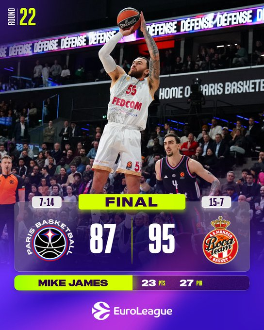 Tras su buen comienzo, James se enfrió mientras Nikola Mirotic y Alpha Diallo asumían un papel más importante, mientras que Matthew Strazel y Elie Okobo se mantuvieron firmes como amenazas anotadoras. Daniel Theis, de vuelta en la rotación tras perderse la jornada 21, realizó varias jugadas clave junto a Kevarrius Hayes, con los dos pívots combinando 7 tapones. La victoria deja al Mónaco con un balance de 15-7, mientras que París cae a 7-14.