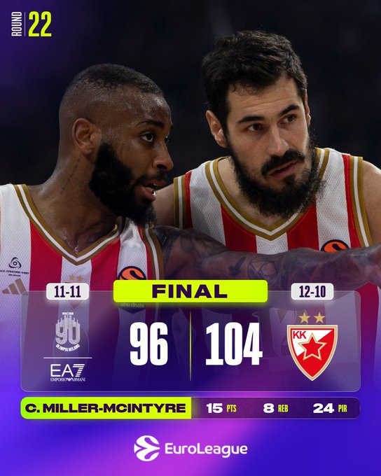 La Estrella Roja remontó una desventaja de 55-44 al descanso para dominar al Milán como visitante y mejorar su marca a 12-10, mientras que el equipo italiano cayó a 11-11 tras una reñida y reñida batalla. Los jugadores de la Estrella Roja recibieron una ovación de pie de parte de la afición visitante después de que el equipo serbio dominara el último cuarto por 14-34, silenciando a la afición local.