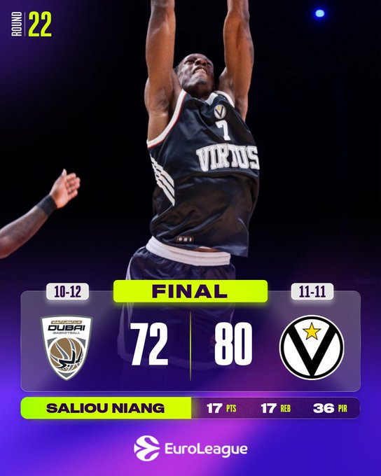 El Virtus hizo lo justo para conseguir una crucial victoria por 72-80 sobre el Dubái el jueves en el Coca-Cola Arena. El triunfo dejó al equipo italiano con un balance de 11-11, su tercera victoria a domicilio de la temporada. El Dubái sufrió su segunda derrota en casa de la temporada, con un balance de 10-12.