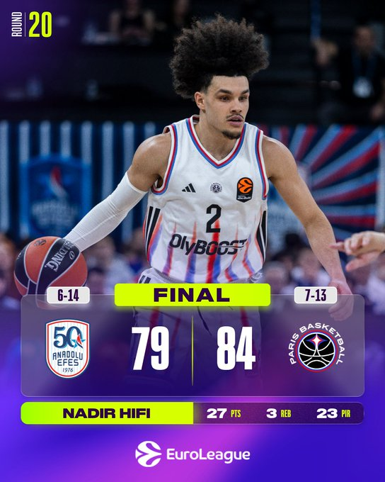 Paris puso fin a una racha de seis derrotas consecutivas como visitante al derrotar a Efes por 79-84. Nadir Hifi anotó 27 puntos, la undécima vez que anota 20 puntos o más en un partido esta temporada.
