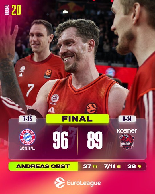 El Bayern celebró su segunda victoria consecutiva tras nueve derrotas consecutivas gracias a la brillante actuación de Andreas Obst, quien estableció nuevos récords de la Euroliga con 37 puntos y 38 de valoración, mientras los locales remontaban una desventaja de 12 puntos en el último cuarto.