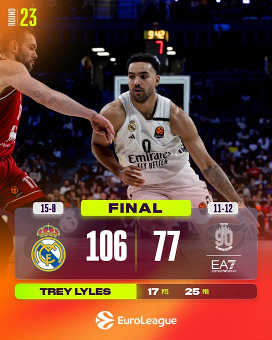 Tras asegurar su undécima victoria en 12 partidos en casa, el Real Madrid mejoró su récord a 15-8, mientras que el Milan cayó a 11-12 tras sufrir su segunda derrota consecutiva. Lyles anotó 17 puntos, el máximo del partido, y Mario Hezonja 13, mientras que David Kramer logró su mejor marca personal con 12. Marko Guduric lideró al Milan con 15 puntos y Armoni Brooks solo anotó 10 en la derrota.