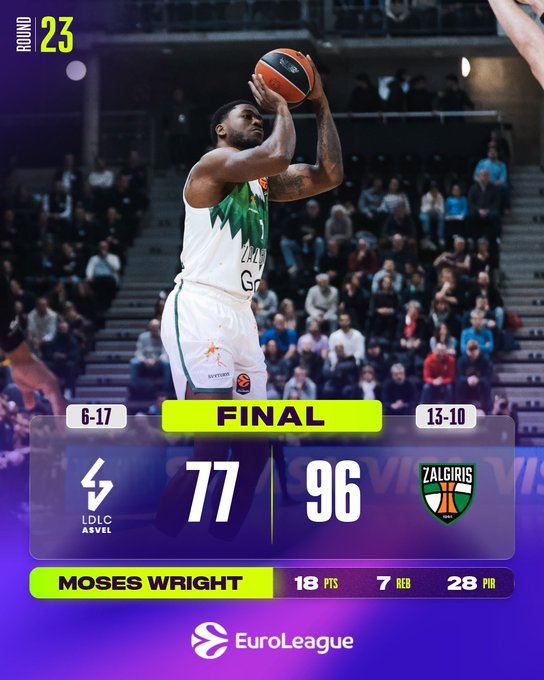 Impulsado por el imparable pívot Moses Wright, el Zalgiris se impuso con una racha de 2-18 en el tercer cuarto para tomar una ventaja inexpugnable de 55-75 antes de los últimos 10 minutos. El Zalgiris aceleró al máximo y se colocó 59-86 en los minutos finales, mientras que el ASVEL no tuvo respuesta para el fluido ataque del equipo visitante, aderezado con una ráfaga de contraataques.