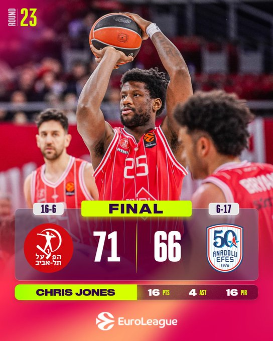 Tras un reñido y físico duelo que se decidió en el último minuto, Hapoel se mantuvo en la cima de la clasificación al derrotar al Anadolu Efes Estambul por 71-66 en Sofía, Bulgaria. Hapoel mejoró su marca a 16-6 con su tercera victoria consecutiva. Mientras tanto, Efes perdió su séptima consecutiva y cayó a 6-17.