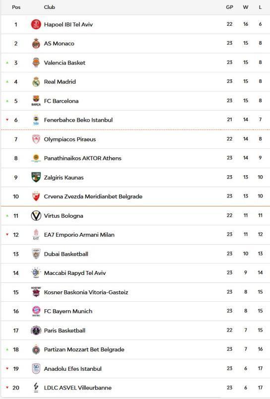 El Partizan rompió una racha de siete derrotas al derrotar al Bayern por 63-67 en el SAP Garden. El Partizan mejoró su marca a 7-16, poniendo fin a su peor racha de derrotas en la competición desde 2012. El Bayern bajó a 8-15 y vio truncada su racha de tres victorias consecutivas en casa.