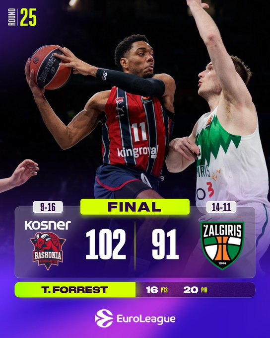Dustin Sleva añadió 13, Moses Wright 12 e Ignas Brazdeikis 11 para los visitantes, que lideraron 84-89 a mediados del último cuarto. Forrest, Kurucs y Luwawu-Cabarrot impulsaron un parcial final de 18-2 que permitió al Baskonia celebrar una reñida victoria.