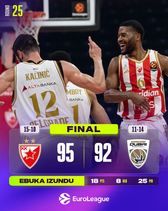 Crvena Zvezda logró su cuarta victoria consecutiva con una cómoda victoria en casa por 95-92 sobre Dubai. El equipo de Sasa Obradovic estableció récords del club en puntos anotados y la mayor diferencia en el primer cuarto al lograr una ventaja de 34-14 en los primeros 10 minutos.