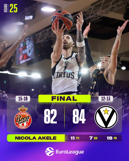 El Virtus perdía por 10 puntos al comienzo del tercer cuarto, pero recortó distancias antes del final del periodo con la ayuda de los pívots Nicola Akele y Aliou Diarra, antes de aprovechar un parcial de 1-15 para abrir el último cuarto y tomar ventaja de 66-77. El equipo local reaccionó y se adelantó con un triple de Mike James (82-81), pero Luca Vildoza anotó un triple a 4 segundos del final para dar a Virtus la victoria y barrer la temporada sobre Mónaco.