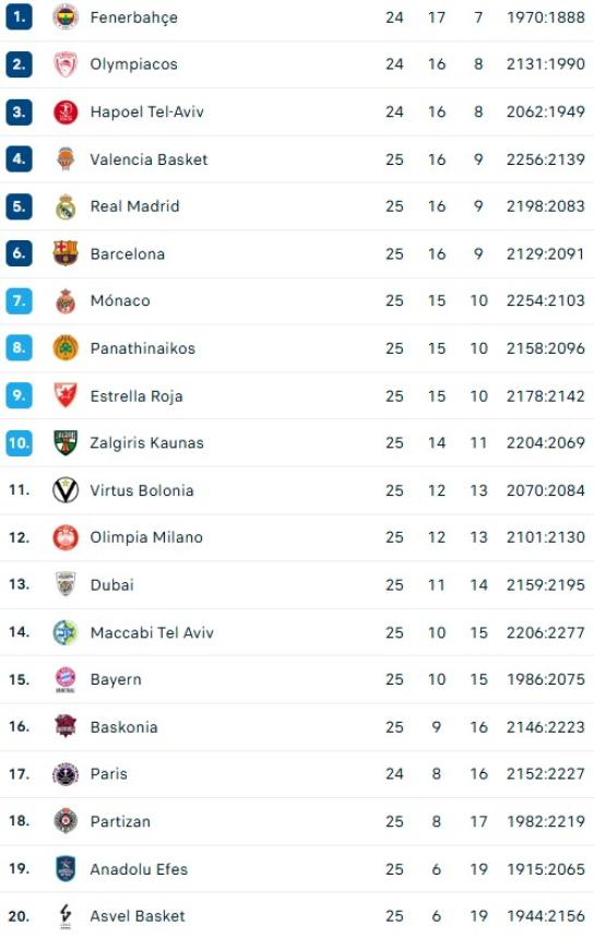 Euroliga: Se completó la jornada 25 que dejó un solo líder